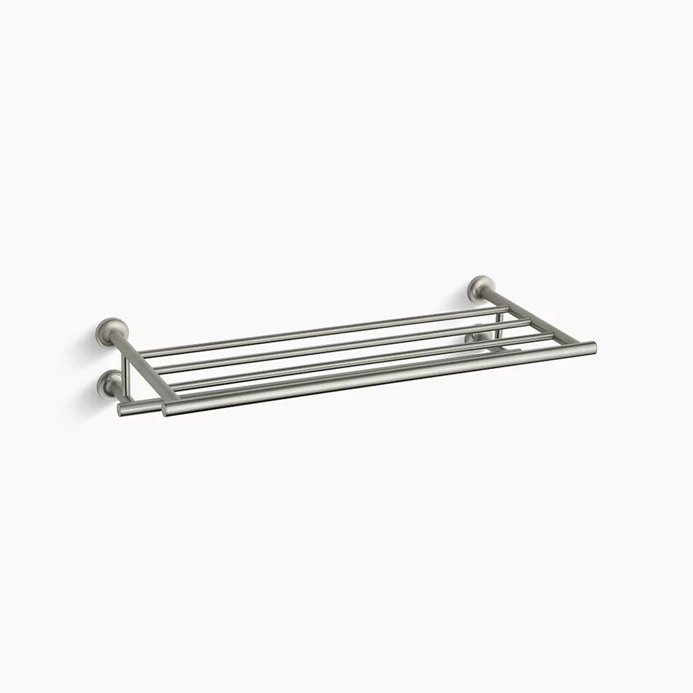 Purist accessories combine a sculptural form with the simple functionality of architectural style. This metal towel shelf provides a distinctive place to store and display bath towels. Available in an array of KOHLER finishes to complement any bathroom decor.