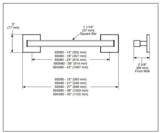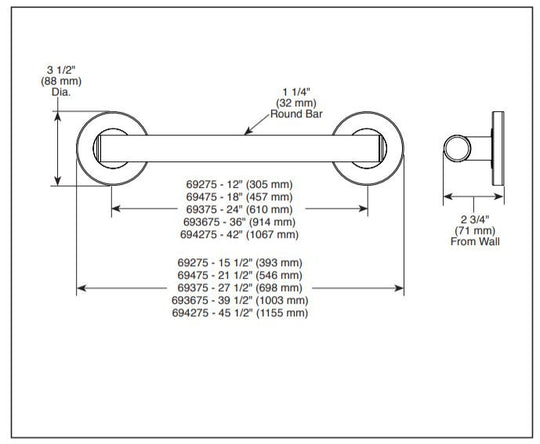 Features 1 1/4" diameter, 3" diameter flanges Extends 2 3/4" from wall, 1 1/2" wall clearance Concealed mounting Mounting hardware & retrievable wall anchor included Supports up to 500 lbs. of force, twice the ADA requirement...Sale price From $238.00Regular price $392.15Sale price From $238.00Regular price $392.15 -