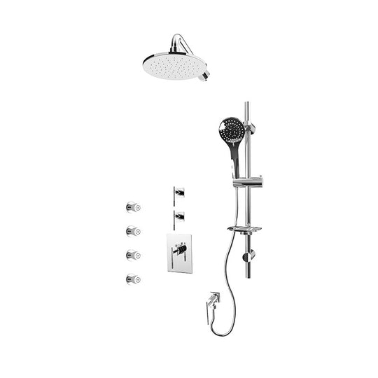 Rubi Evita 3/4" Thermostatic Shower Kit with Standard Stop Valve, Round Sliding Bar with Hand Shower, 8" Round Shower Head, Horizontal Shower Arm, Stop Valve with Water Outlet, and Body Jets Chrome