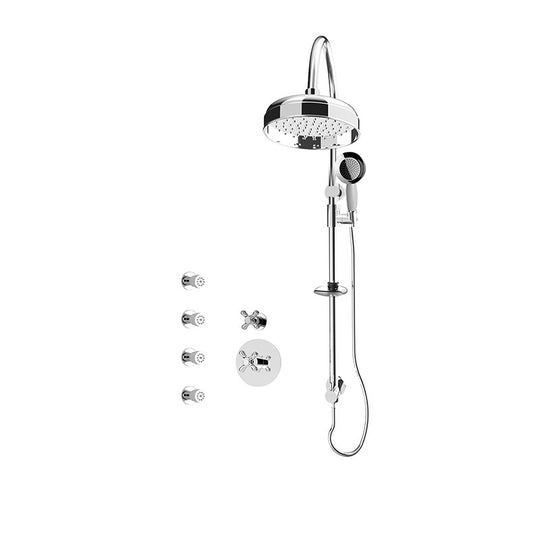 Sale -20%    Vendor: York Bath Rubi Jade 3/4" Thermostatic Shower Kit with Standard Stop Valve, Antique Sliding Bar with Hand Shower, Round Shower Head, Vertical Shower Arm, Stop Valve with Water Outlet, and Body Jets Chrome Features Built-in rough 3/4" thermostatic mixer - 57 L/min (3 BAR) - 15 gpm (45 PSI) Standard stop valve Round sliding bar with hand shower 8" Round shower head 8" Vertical shower arm Stop valve with...Sale price $1,820.80Regular price $2,276.00Sale price $1,820.80Regular price $2,276.00