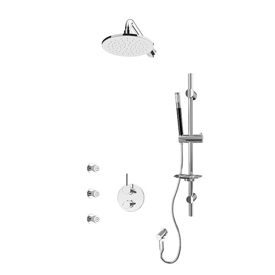 Rubi Kronos 1/2" Thermostatic Shower Kit with Round Sliding Bar with Hand Shower, Round Shower Head, Horizontal Shower Arm, Stop Valve with Water Outlet, and Body Jets Chrome