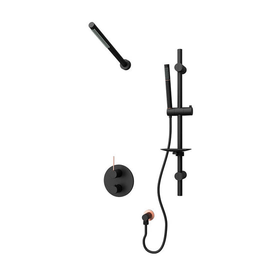 Rubi Kronos 1/2" Thermostatic Shower Kit with Round Sliding Bar with Hand Shower, Wall Mounted Solid Brass Shower Head, and Round Elbow Connector with Water Outlet Matte Black/Copper