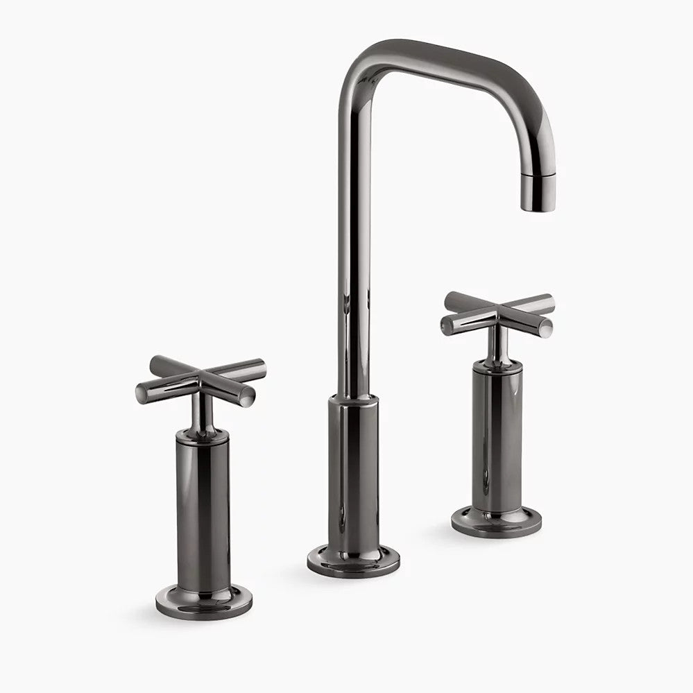 Combining architectural forms with sensual design lines, Purist faucets and accessories bring a touch of modern elegance to your bathroom. This sink faucet exemplifies the Purist collection's understated style, with its high gooseneck spout and high cross handles. Easy-to-install and leak-free UltraGlide(TM) valves provide reliable performance and durability. And the spout features laminar flow, which helps conserve water while preventing splashing.