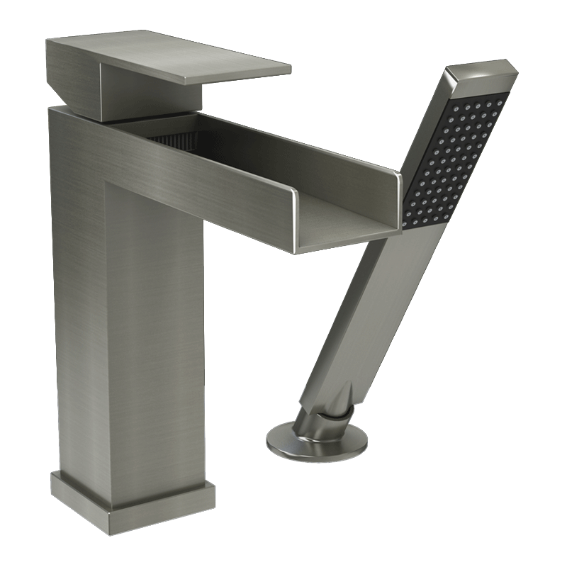 - Two-piece deck mounted bath faucet with hand shower