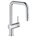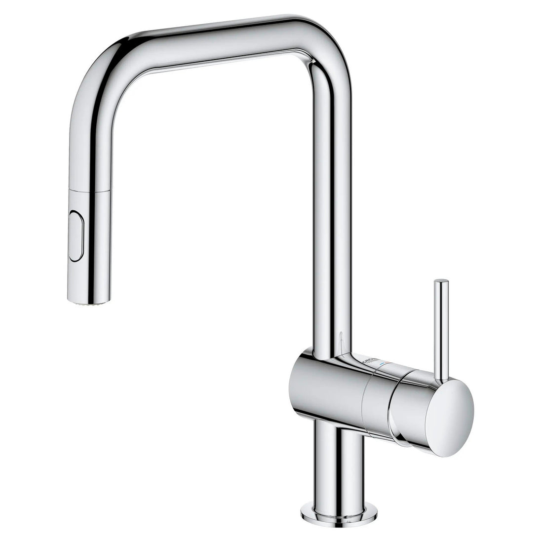 The GROHE Minta Dual-Spray Pull-Down Kitchen Faucet is a contemporary single-handle faucet with impressive U-shaped spout. Convenient pull-down spray head easily toggles between regular water flow and spray for maximum versatility from filling pots to rinsing the sink. This single-hole kitchen faucet is meticulously crafted with a 360° swivel spout and lever handle that offers precise control of water pressure and temperature.