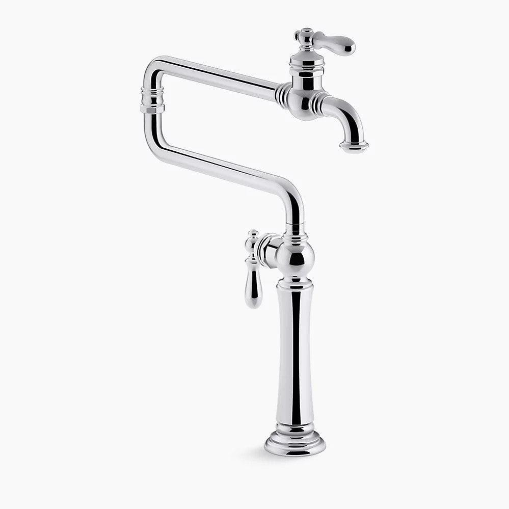 The KOHLER® Artifacts faucet collection brings you classic designs reimagined in fresh new ways for various task areas of the kitchen. This deck-mount pot filler's Artifacts pot filler faucet displays vintage style while bringing professional convenience to home cooks. With a full 22" reach, the deck-mount articulating swing spout lets you fill large pots directly on or near the stovetop, then folds out of the way when not in use.