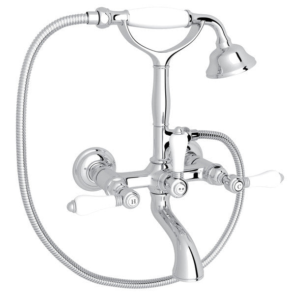 ROHL Exposed Wall Mount Tub Filler with Handshower - Chrome with White Porcelain Lever Handle