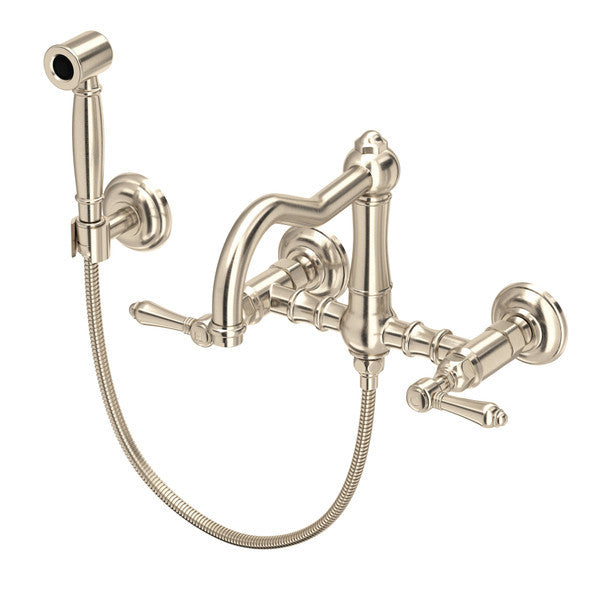ROHL Acqui Wall Mount Column Spout Bridge Kitchen Faucet With Sidespray - Satin Nickel With Metal Lever Handle