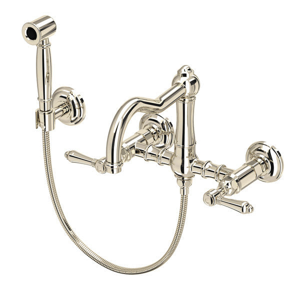ROHL Acqui Wall Mount Column Spout Bridge Kitchen Faucet With Sidespray - Polished Nickel With Metal Lever Handle