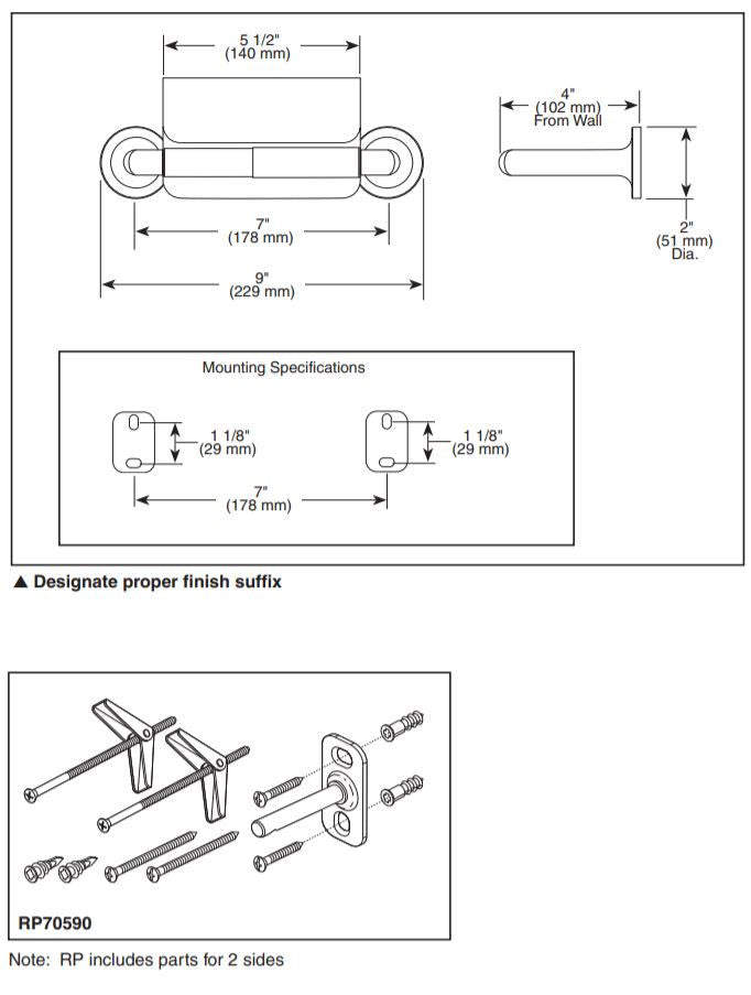 fasteners are suggested: Tile/Masonry-Plastic or lead Anchors; Plaster/drywall-Toggle bolts - Mounting hardware and mounting instructions included with product