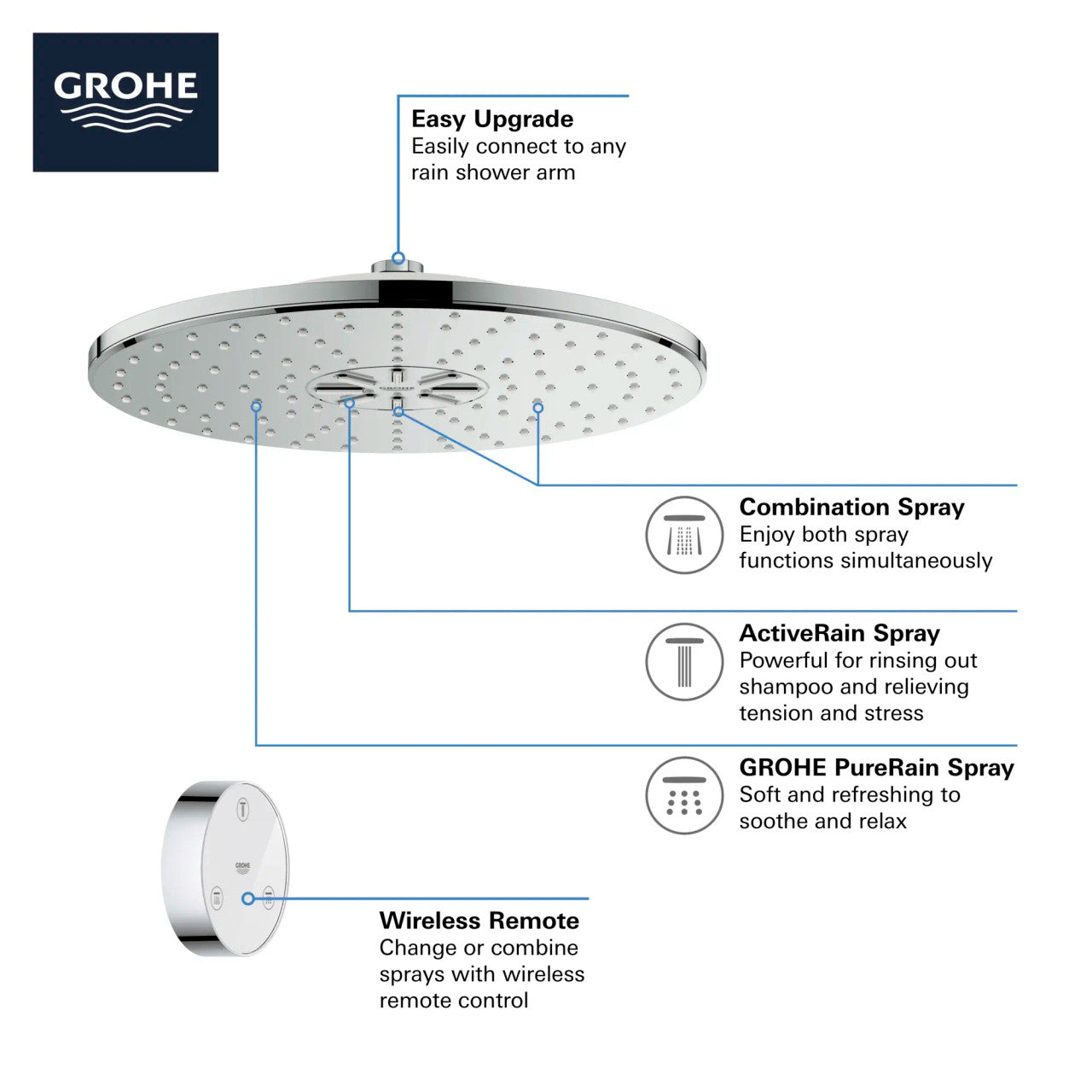 - Three spray functions include the relaxing GROHE PureRain, powerful ActiveRain, or a combination of both sprays