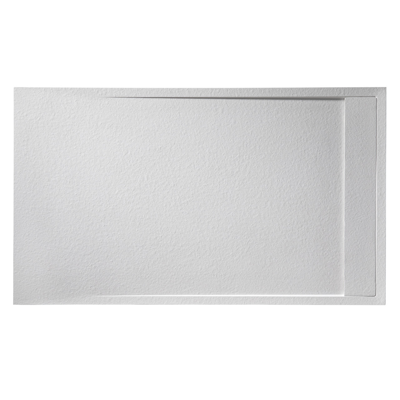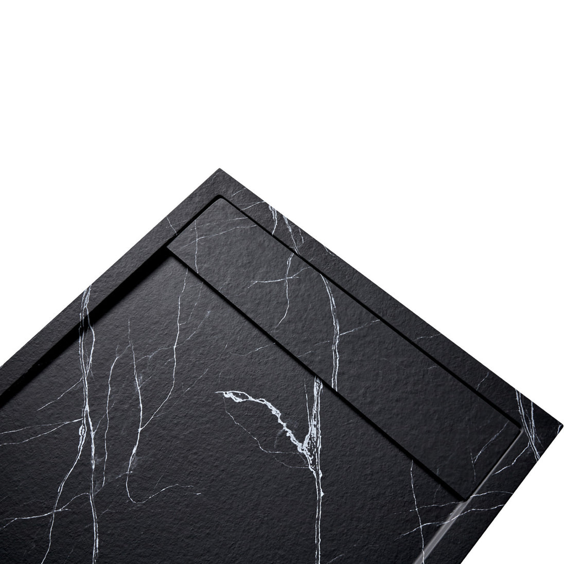 Since all these rectangular bases are finished on all sides, the drain could be positioned on the right or the left of the shower
