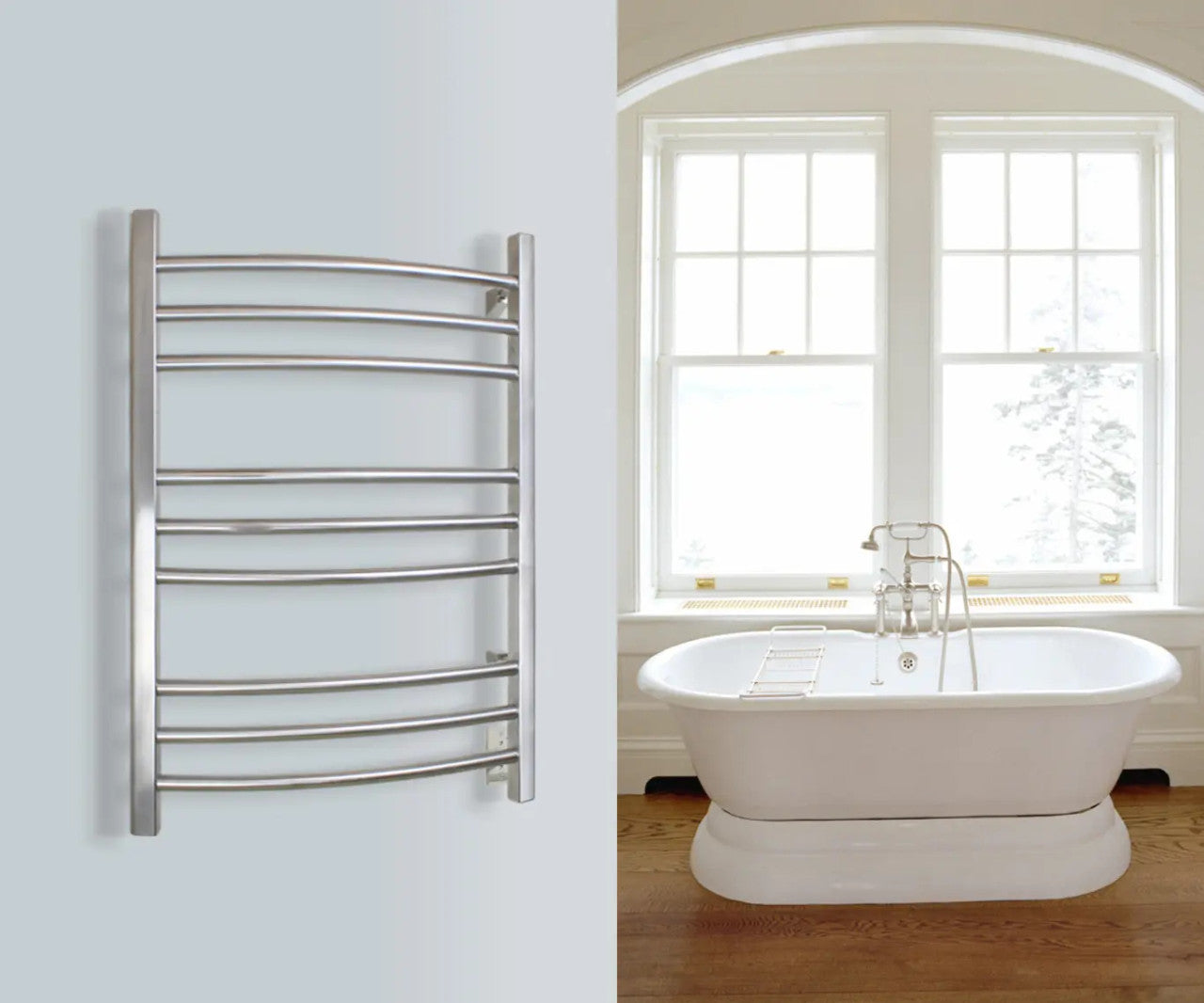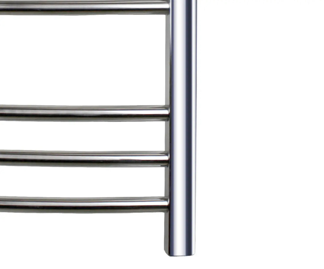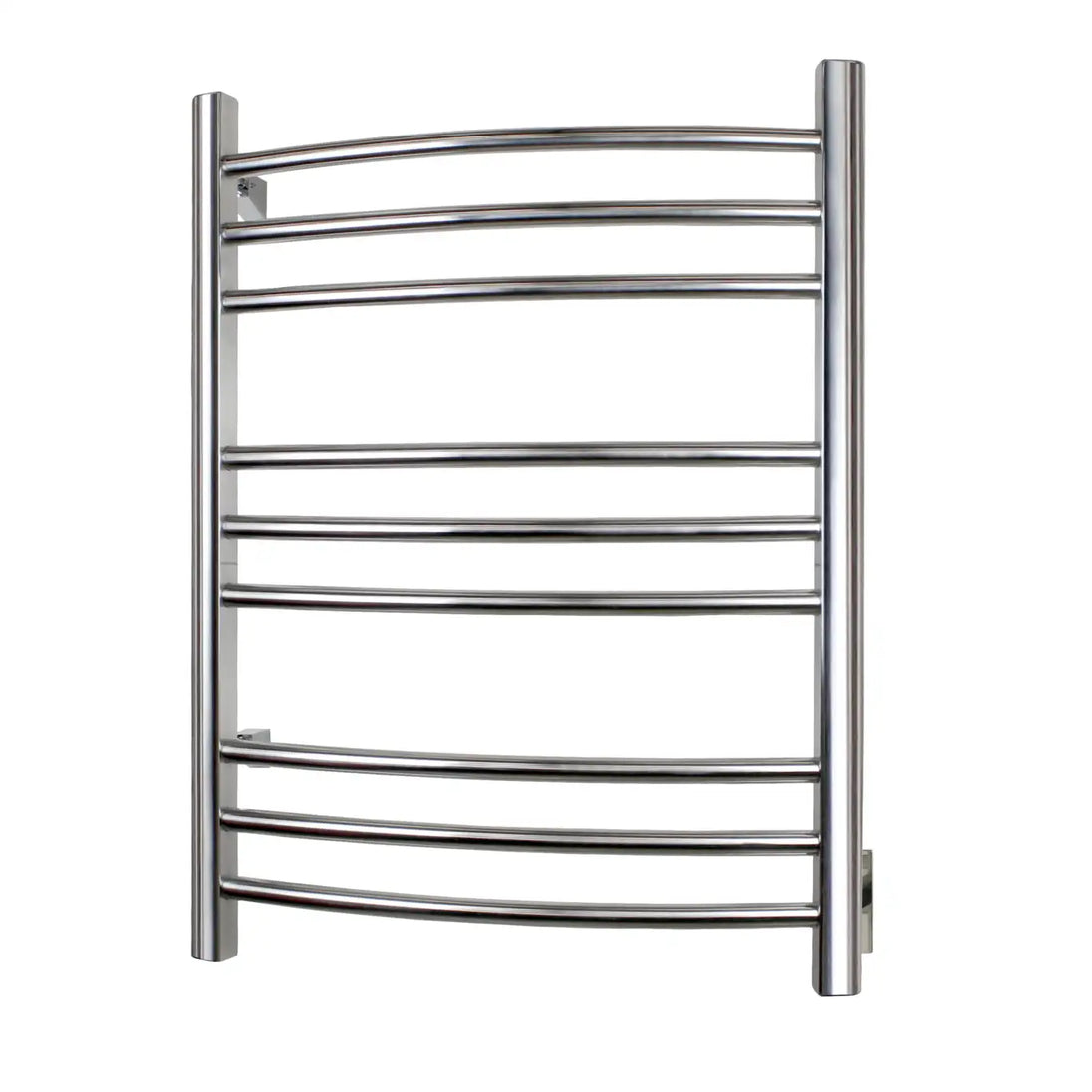 Add luxury and elegance to your master bath with a WarmlyYours Riviera Towel Warmer. The polished, stainless steel finish and curved bars enhance the style of your décor, turning your bathroom into an in-home spa with soft, gently heated towels available any time. At 24”W x 32”H x 6.125”D with nine rounded bars, the Riviera provides plenty of space for two towels or a bathrobe. Wall-mounted and hardwired, this 120V towel warmer yields 150 watts to safely and gently heat your towels. The Riviera has a built-in on/off switch and this model can also be paired with a programmable timer (sold separately), allowing you to preset it to your schedule, so you have warm, fluffy towels at your fingertips whenever you want.